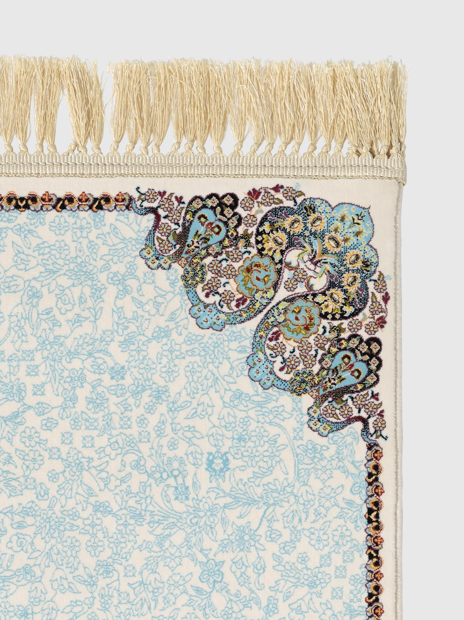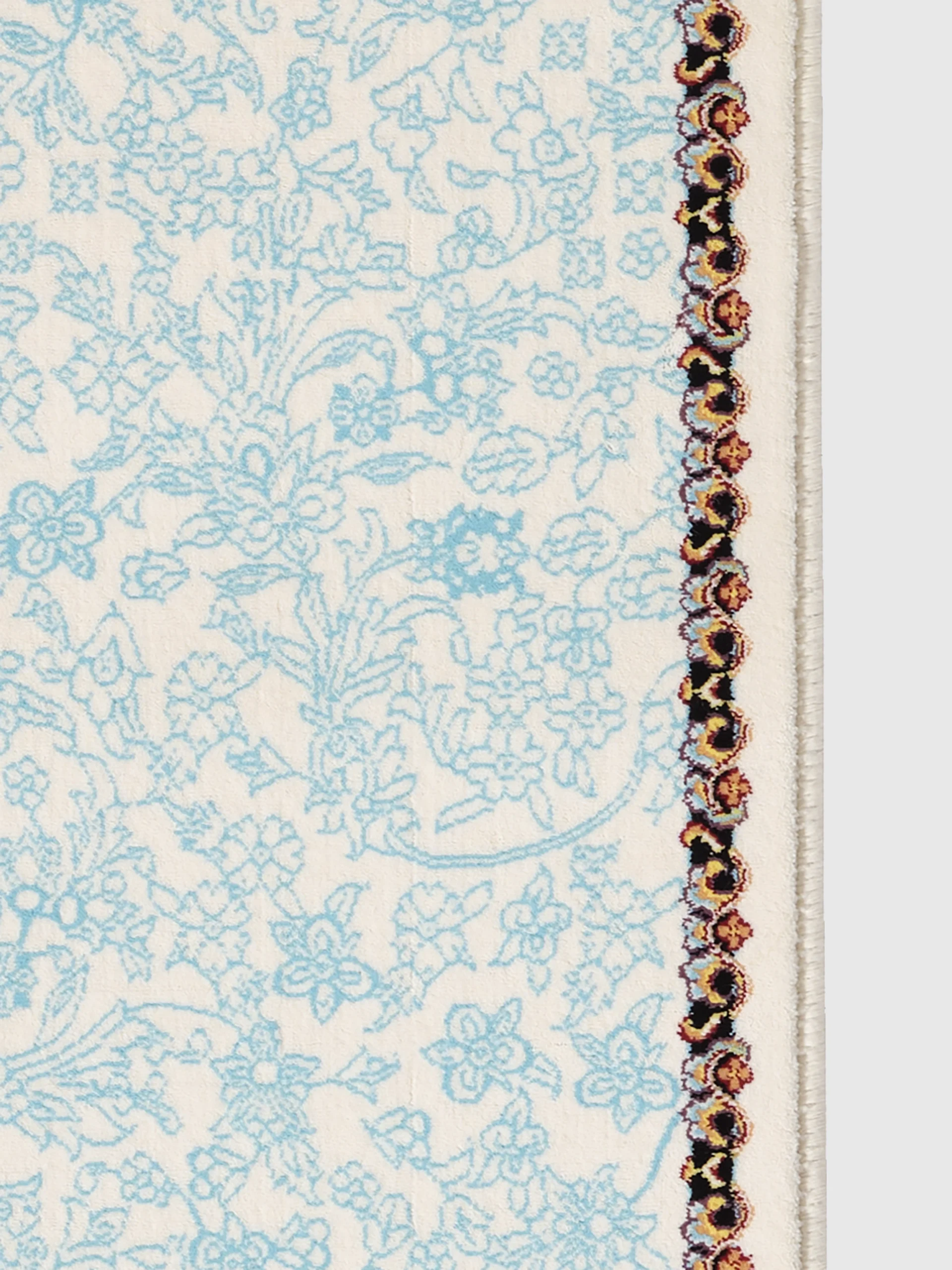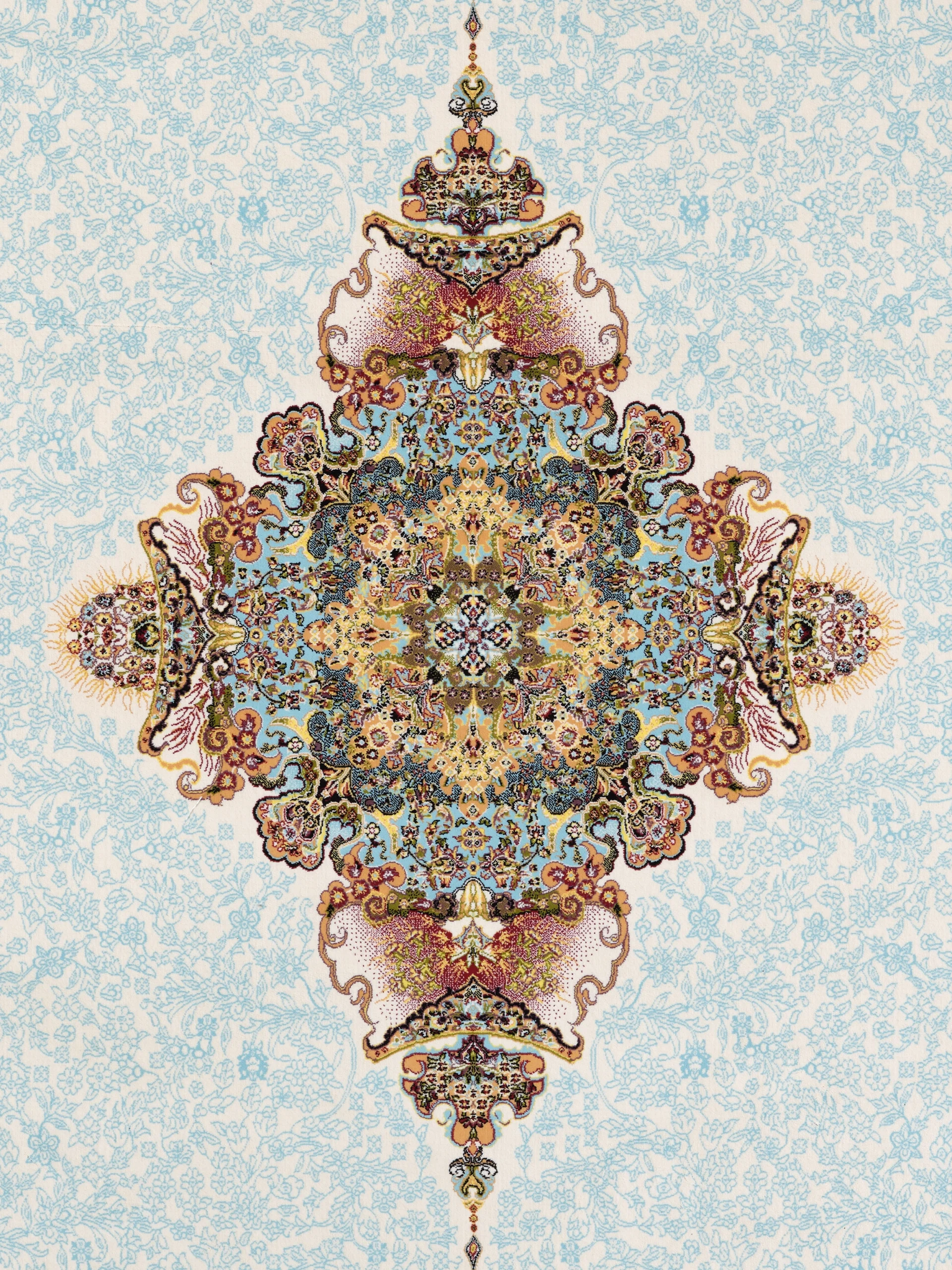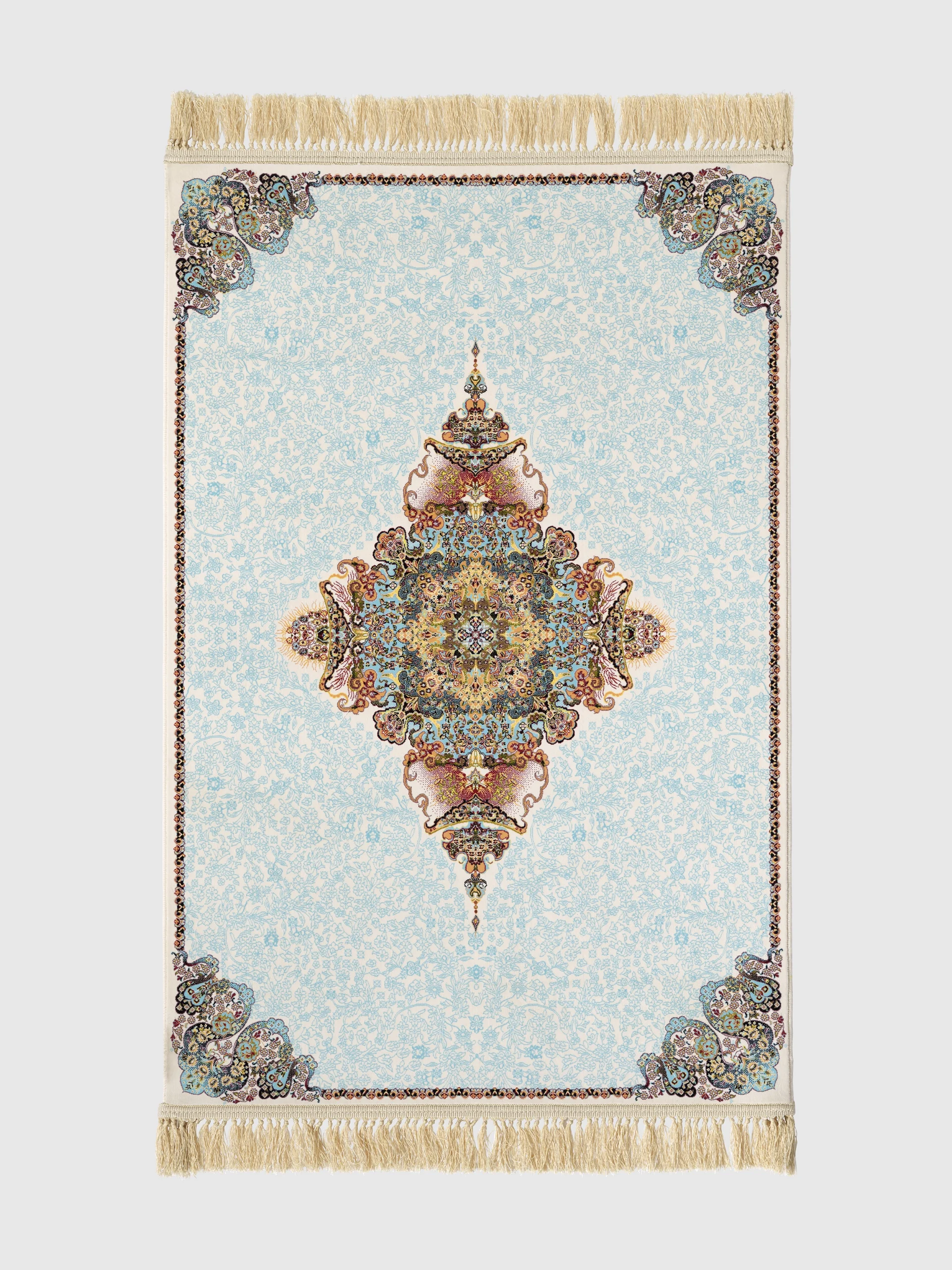 Ava has a calm light blue background with a detailed centre medallion in soft tones like turquoise, beige, rose, and gold. The corners are finished with matching details, giving the rug a balanced and easy look.