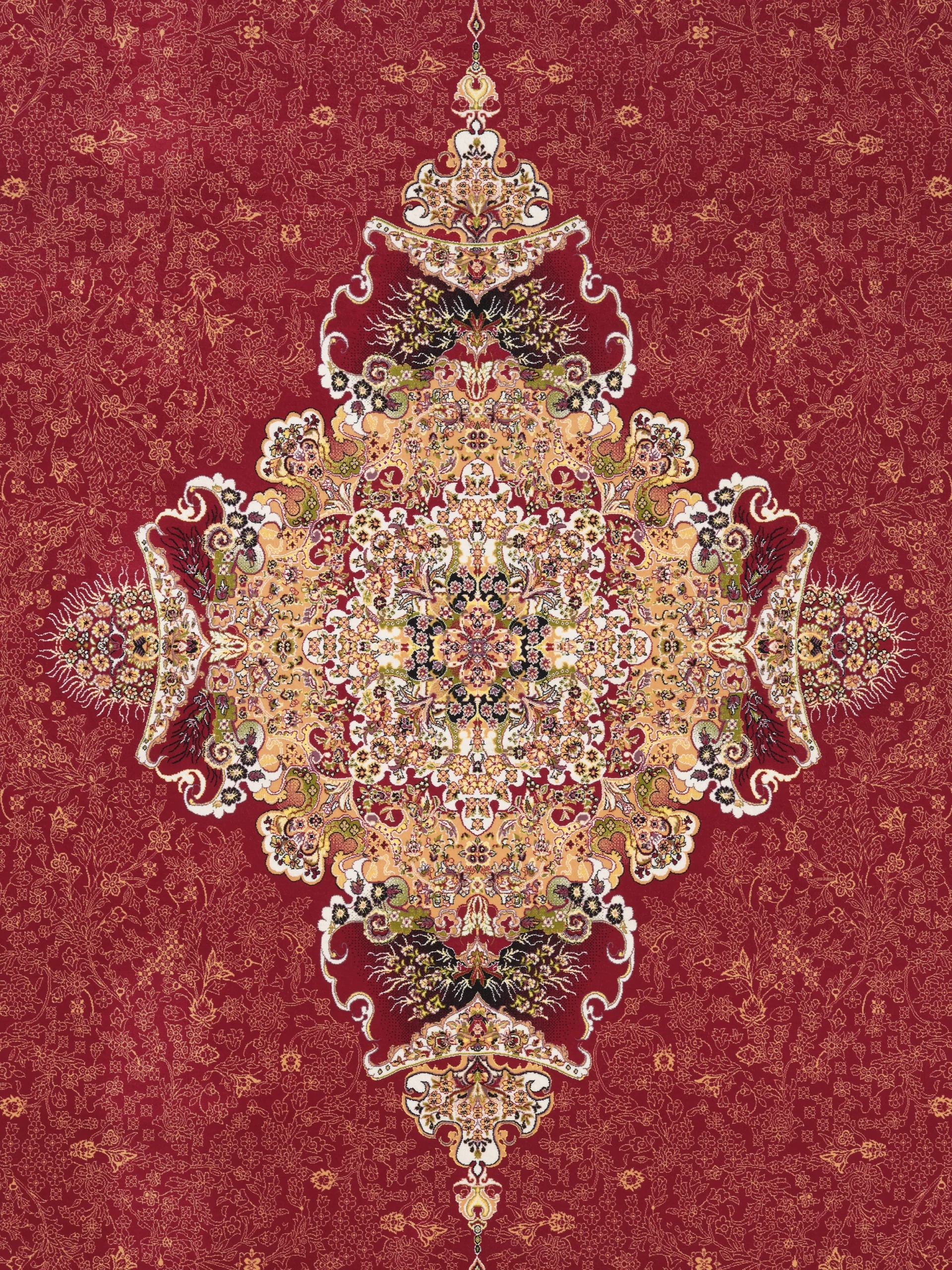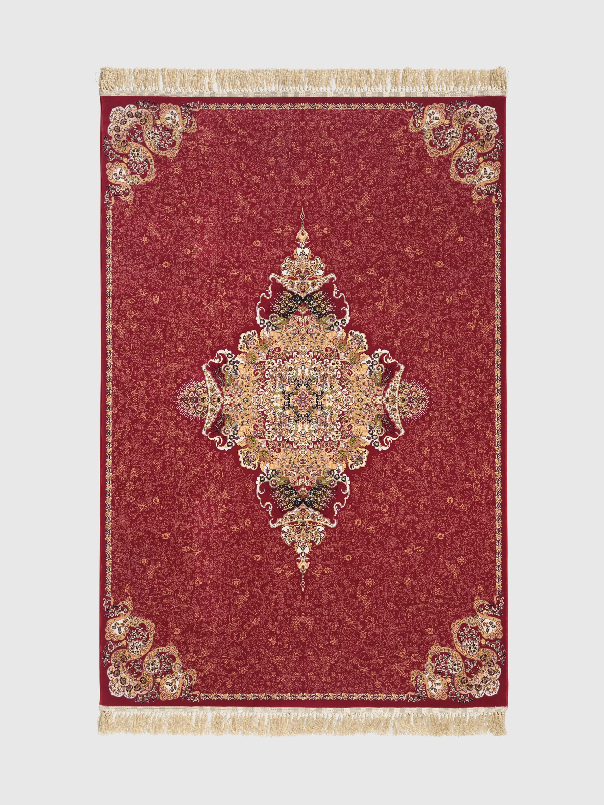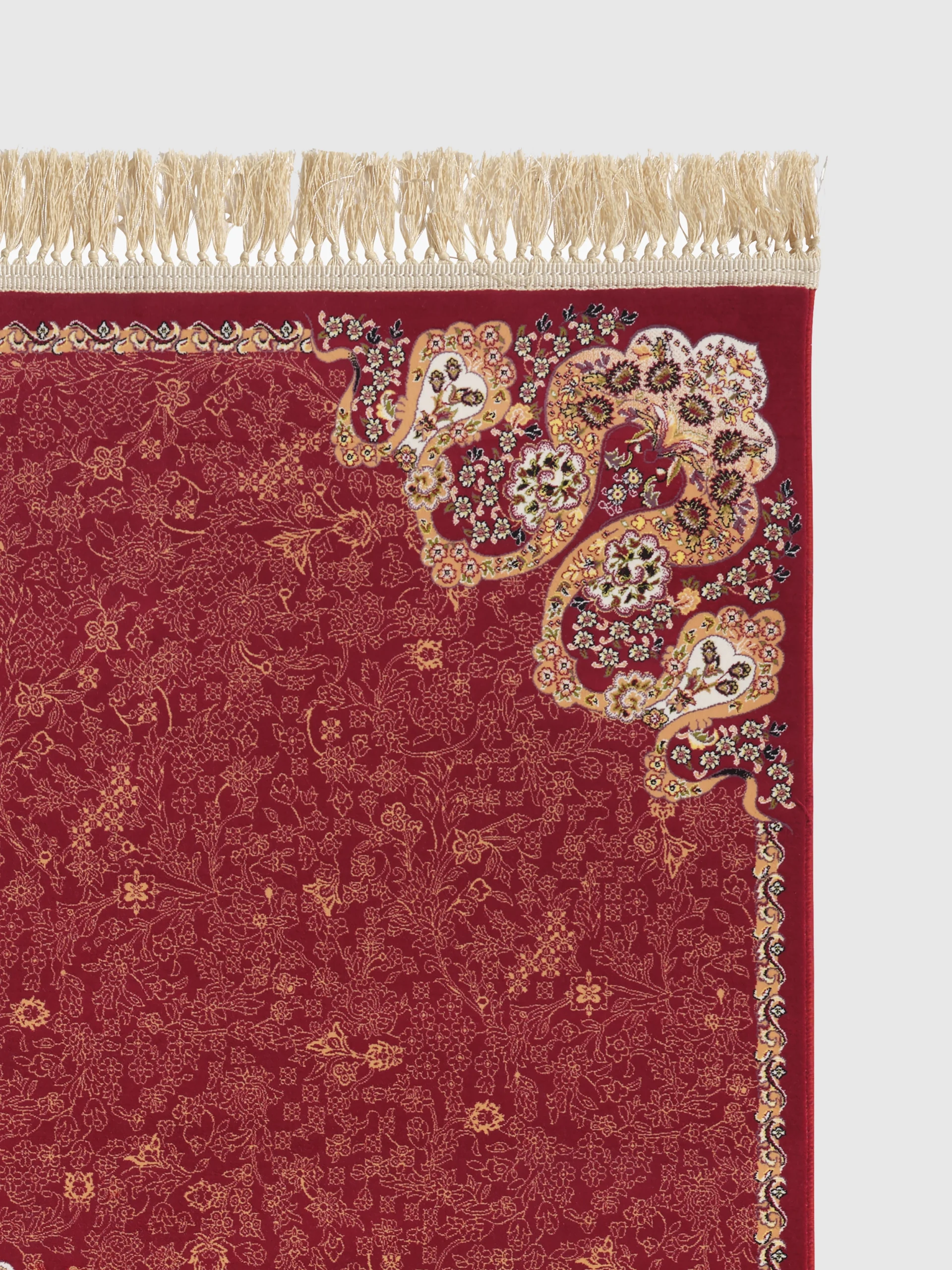 Nira stands out with its deep red base and a detailed centre pattern in beige, gold, and soft darker tones. The corners and fine border details keep the design balanced and give the rug a clean finish.